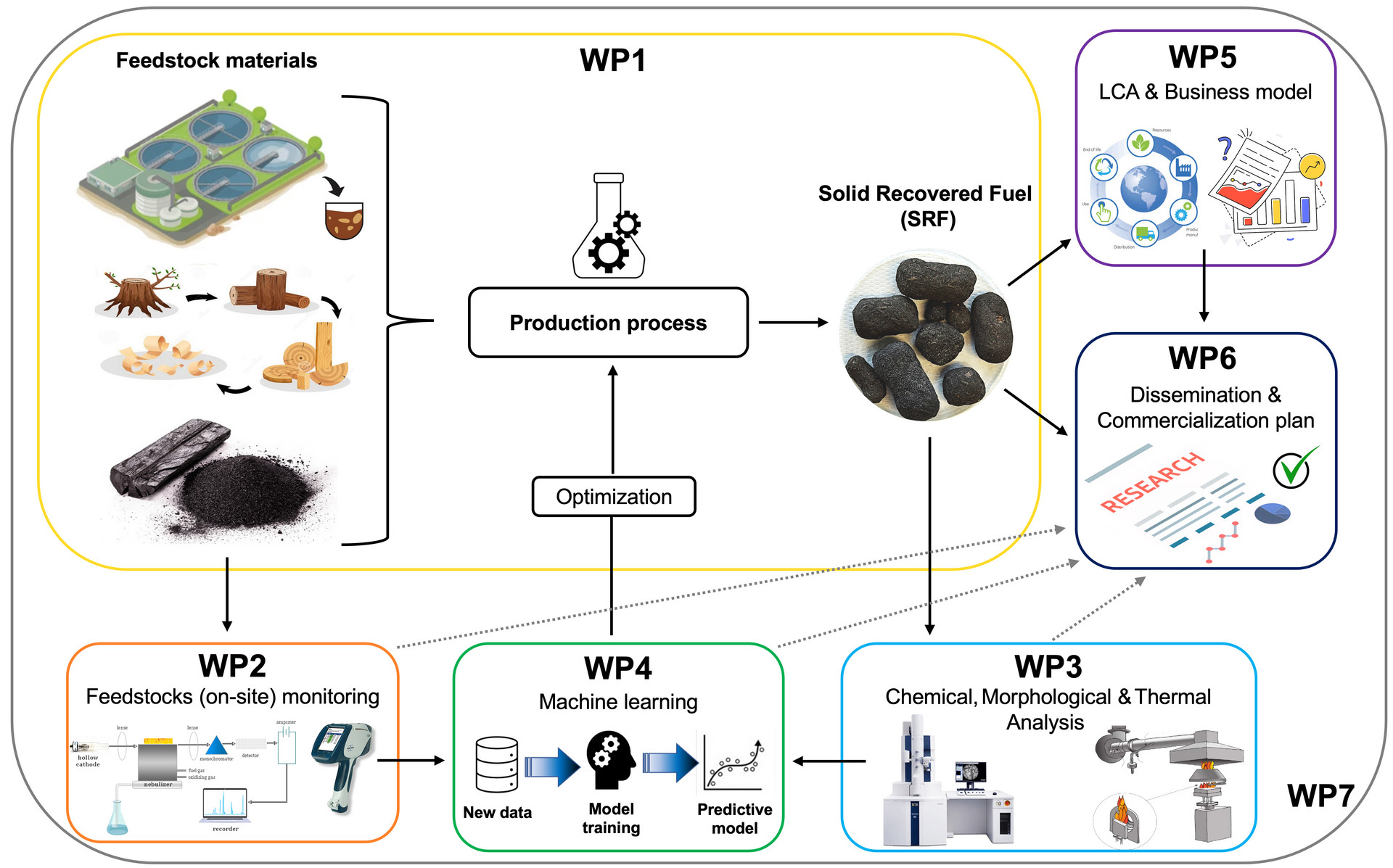 Vzporedno bo izvedena LCA analiza za oceno okoljskega vpliva celotnega procesa, od zbiranja blata iz čistilnih naprav do končne uporabe, kar bo zagotovilo celovito trajnostno analizo, vključno z okoljskimi koristimi in kompromisi. Na podlagi interdisciplinarnega znanja bo projekt vključeval tudi razvoj poslovnega modela in načrta komercializacije, prepoznavanje tržnih priložnosti in ekonomske izvedljivosti za povečanje proizvodnje SRF ter integracijo novih tehnologij v obstoječe sisteme ravnanja z odpadki in energetske sisteme (tj. peči).